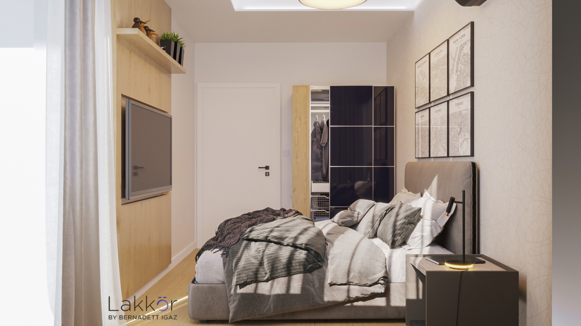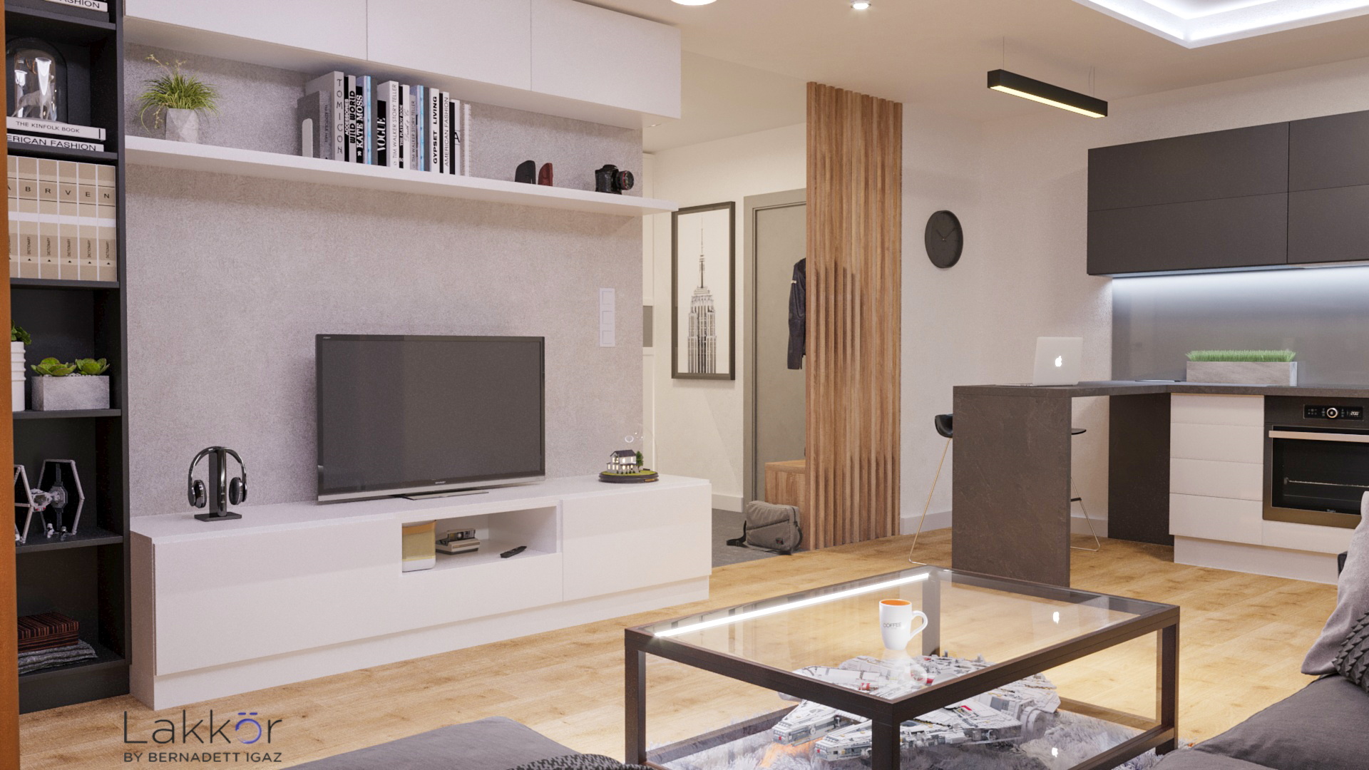 Íme az elkészült tervek: az egyterű konyha-nappali egyedi tervezésű bútorai harmóniát sugároznak, a színek tökéletesen hozzák a stílus elvárásait. A burkolatok mindenhol letisztultak és igényesek. A pici fürdőszoba nagy zuhanykabint kapott, hogy a reggeli felfrissülés garantált legyen. A hálószoba tökéletes privát szféra, ahol kényelem és nyugalom várja a hazaérkezőt. A vendég-dolgozó szoba lett a kedvenc tárgyak „tárháza”, az előtér pedig – a térelválasztónak köszönhetően – szerves része az enteriőrnek.