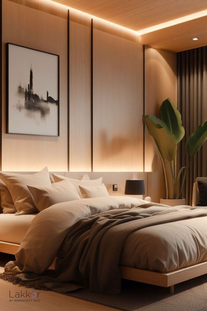 A fa bútorok és kiegészítők melegséget és harmóniát hoznak a térbe, megteremtve ezzel a Japandi stílus alapjait. A szőnyegek legyenek igazán természetes anyagból, puhaságot és lágyságot varázsolva a legintimebb életterünkbe. A világítás kialakításánál figyelni kell arra, hogy sokféle lehetőséget kiszolgáljon; hangulati, általános és direkt fényekre szükség lesz ebben a helyiségben.