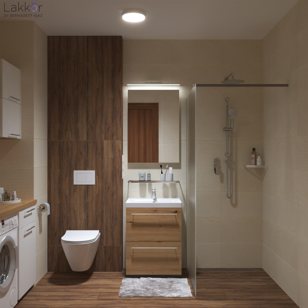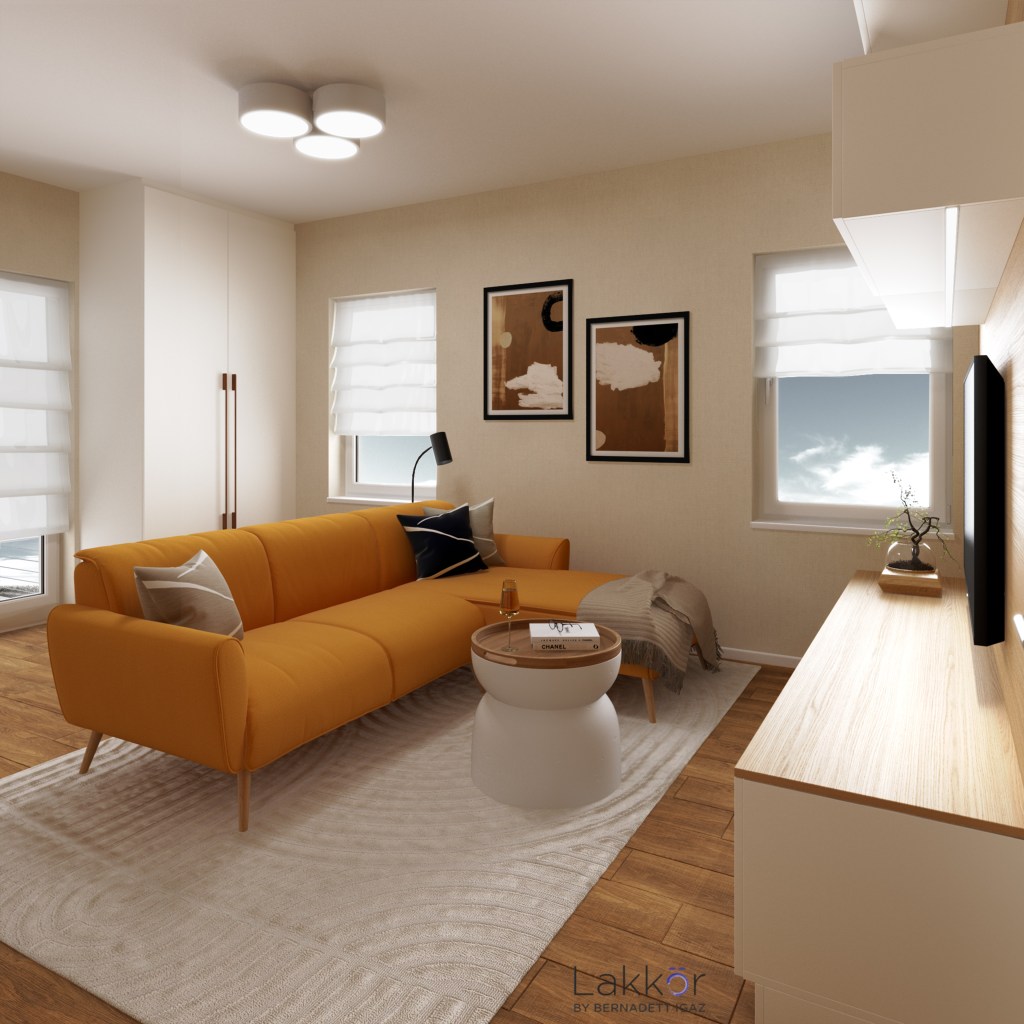 Ennek az újonnan épült 50 négyzetméteres lakásnak a tulajdonosa is rögtön beleszeretett a stílus bézses színvilágába és a fa hatású burkolatokba. Az első emeleten elhelyezkedő ingatlan remek fekvése, a rengeteg üveg felület és a lakáshoz kapcsolódó kényelmes méretű erkély valóban ideális volt egy új otthon kialakítására. A kivitelezés már javában folyt, amikor a megrendelő a segítségemet kérte a terek megtervezésére. A gépészeti és elektromos kiállásokon, valamint a burkolatokon már nem tudtunk módosítani, így az egész tervezési folyamat alatt rugalmasnak és kreatívnak kellett lennünk.
