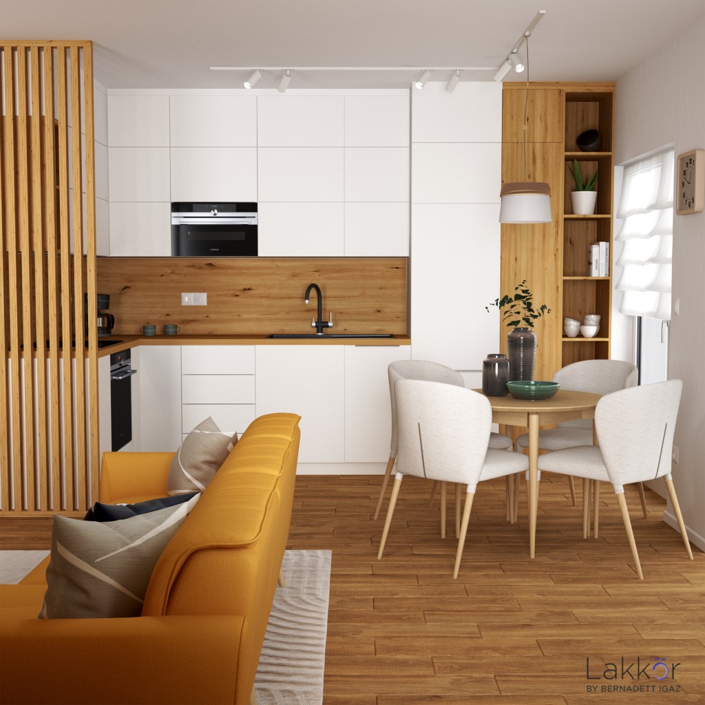 Mivel a konyha-étkező-nappali egy légtérben helyezkedik el, ezért figyelnem kellett, hogy a sok funkció ellenére is kellően szellős és jól használható életterek alakuljanak ki. Már a hangulati tablók összeállításánál is arra törekedtem, hogy megtaláljam a skandináv lakberendezési stílushoz jól illeszkedő színeket a megrendelő számára. Mivel egy élettel teli, vidám otthon megteremtésé volt a cél, így több színt és behoztam a lakásba. A fehér alapszín mellett a homokszín, a puha zöld és az indiai sárga kapott még főszerepet. Azonban a textilek és a dekor termékek kiválasztásával válik egy tér valóban otthonossá. Ebben már a visszafogottság vezetett: a világos színű szőnyeg, az ablakba simuló függönyözés, valamint az egyszerű dekoráció pont elég volt arra, hogy megszülethessen egy hangulatos és barátságos otthon.