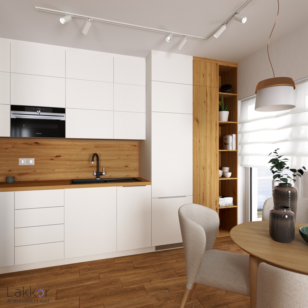 A legnagyobb kihívást az jelentette, hogy megtaláljam azokat az anyagokat és színeket, melyek a különböző fahatású burkolatokkal és a beltéri ajtók színével is remekül „együttműködnek”. A skandináv lakberendezési stílusra jellemző világos bútor frontokkal és a fa hatású munkalapokkal egy egyszerű, letisztult és modern enteriőr létrehozása volt a cél. Ezért az anyagok kiválasztásánál külön figyelmet szenteltem annak, hogy a már meglévő burkolatokhoz megtaláljam a tökéletes munkalapokat.
