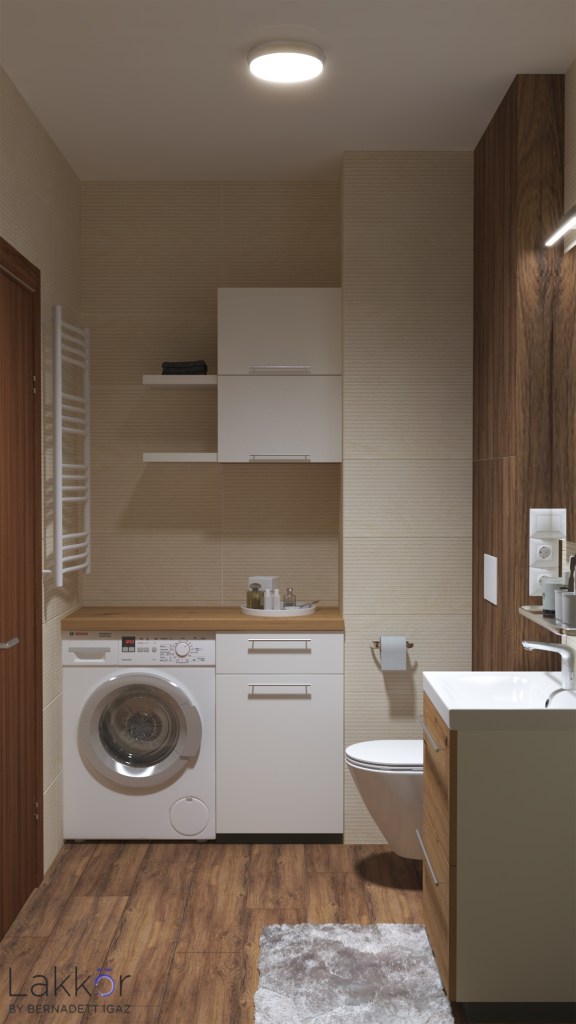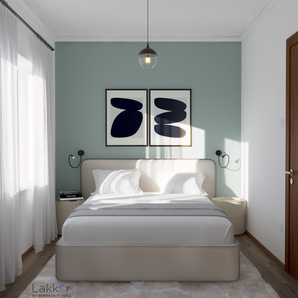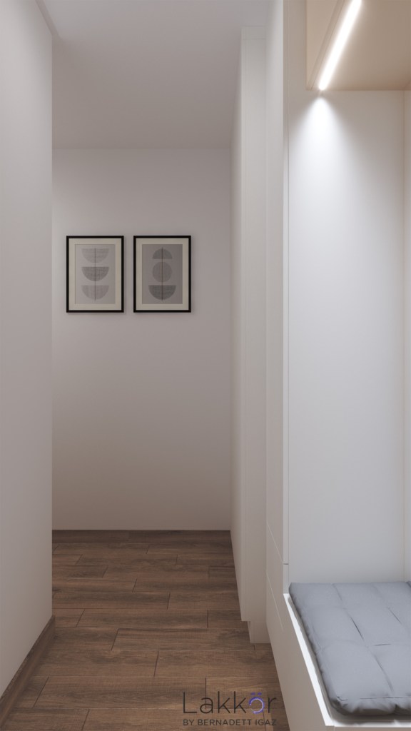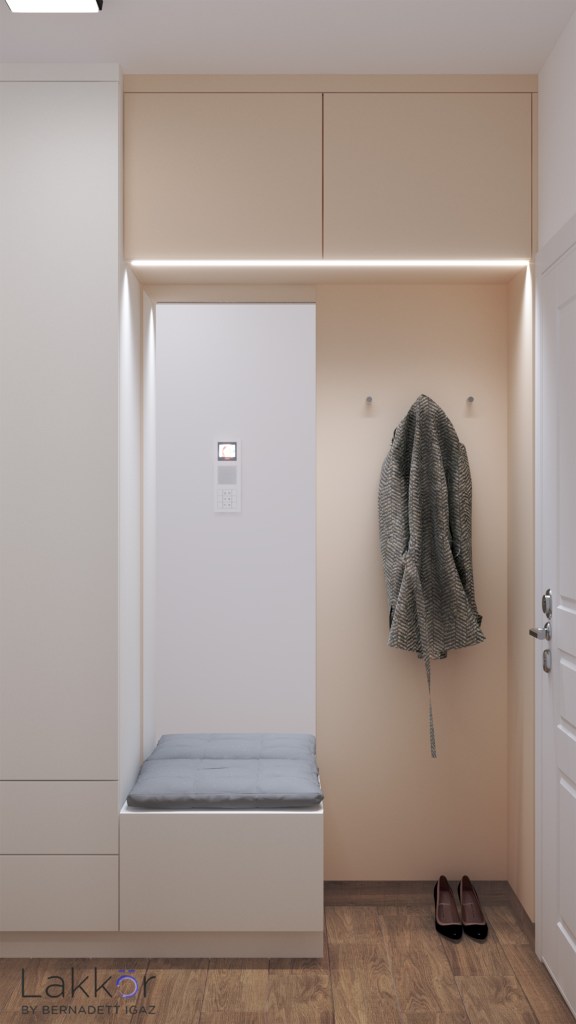 A lakásba érkezve már az előtérben egy kellemes színvilágú és minimalista tér fogadja a hazaérkezőt. A taroló bútorok jól elrejtik a kabátokat, cipőket és a takarítóeszközöket. A hálószoba egy kellemes zöld színt kapott, amelyhez jól illenek a világos, modern vonalvezetésű bútorok. A fürdőszoba kicsi, mégis tökéletesen funkcionál; itt lett elhelyezve a mosógép, elrejtve a szennyes tároló és sikerült megfelelő mennyiségű tárolóbútort is betervezni.
