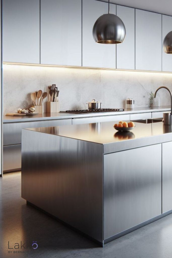 3. A rozsdamenetes acélból készült konyhai munkapultok és hátlapok professzionális megjelenést adnak a helyiségnek. Hihetetlenül tartósak, könnyen tisztíthatóak és hőállóak. Akik szeretik a letisztult és egyszerű anyagokat a konyhában, vagy rajonganak a high-tech stílusért, azoknak ez a legjobb választás.